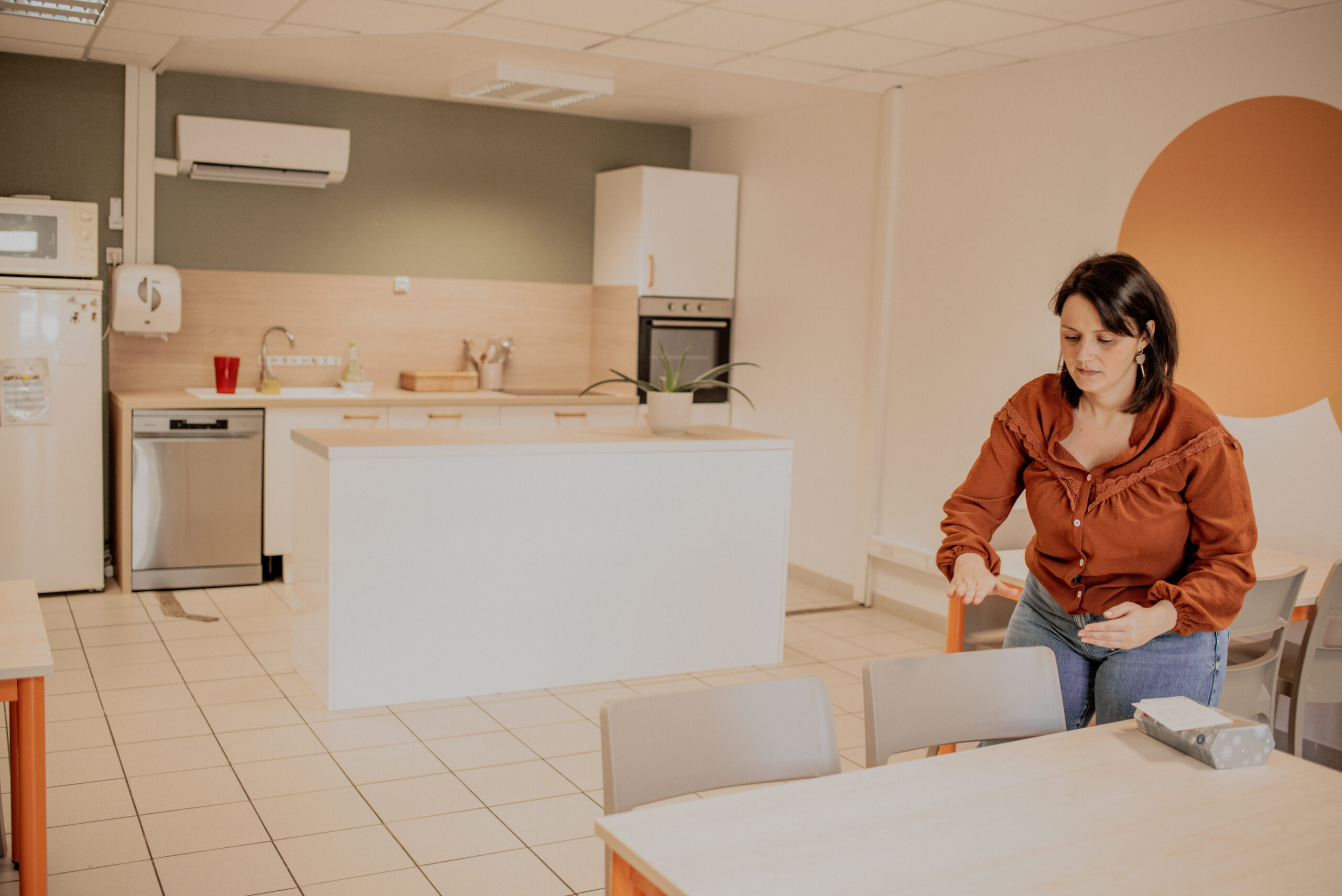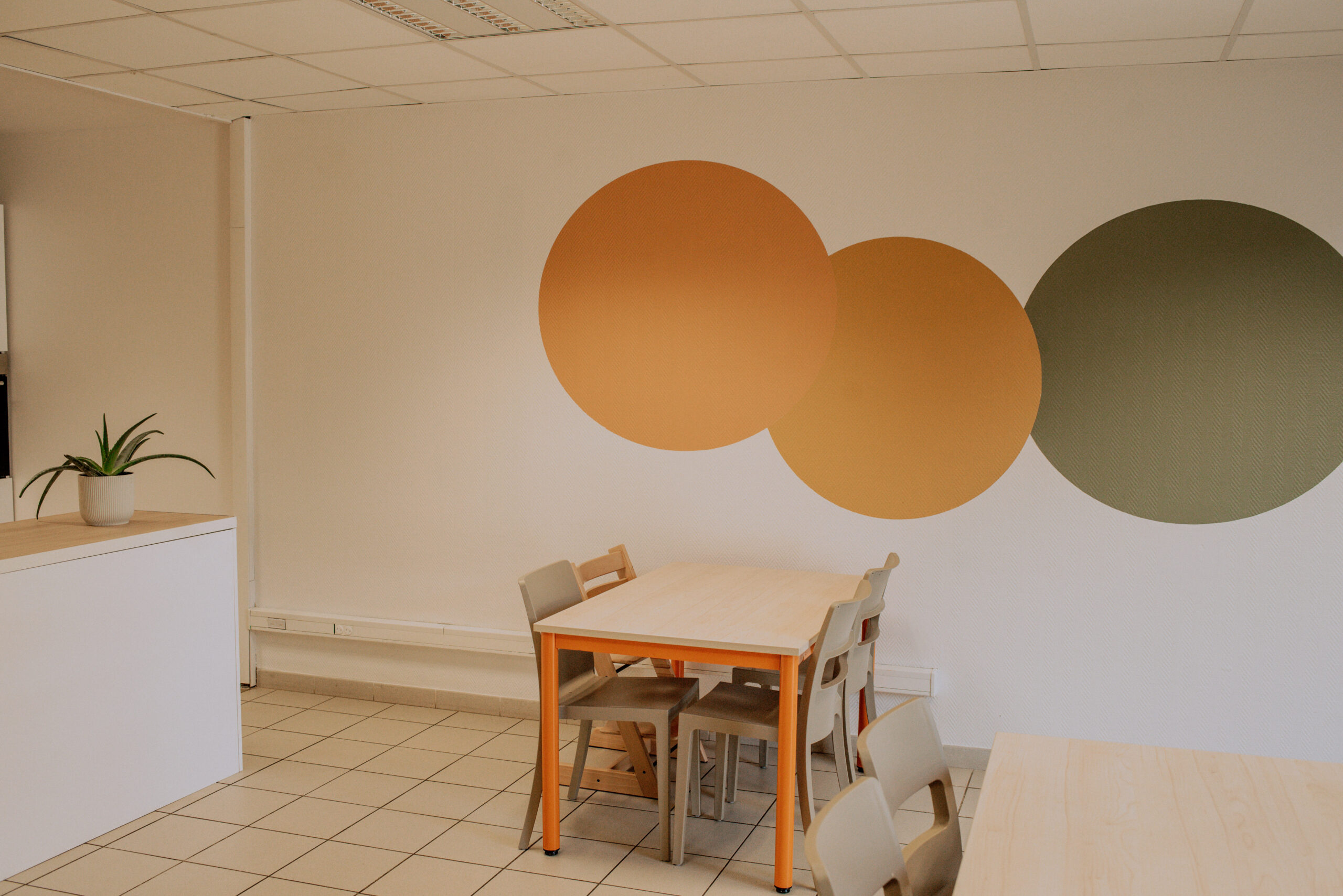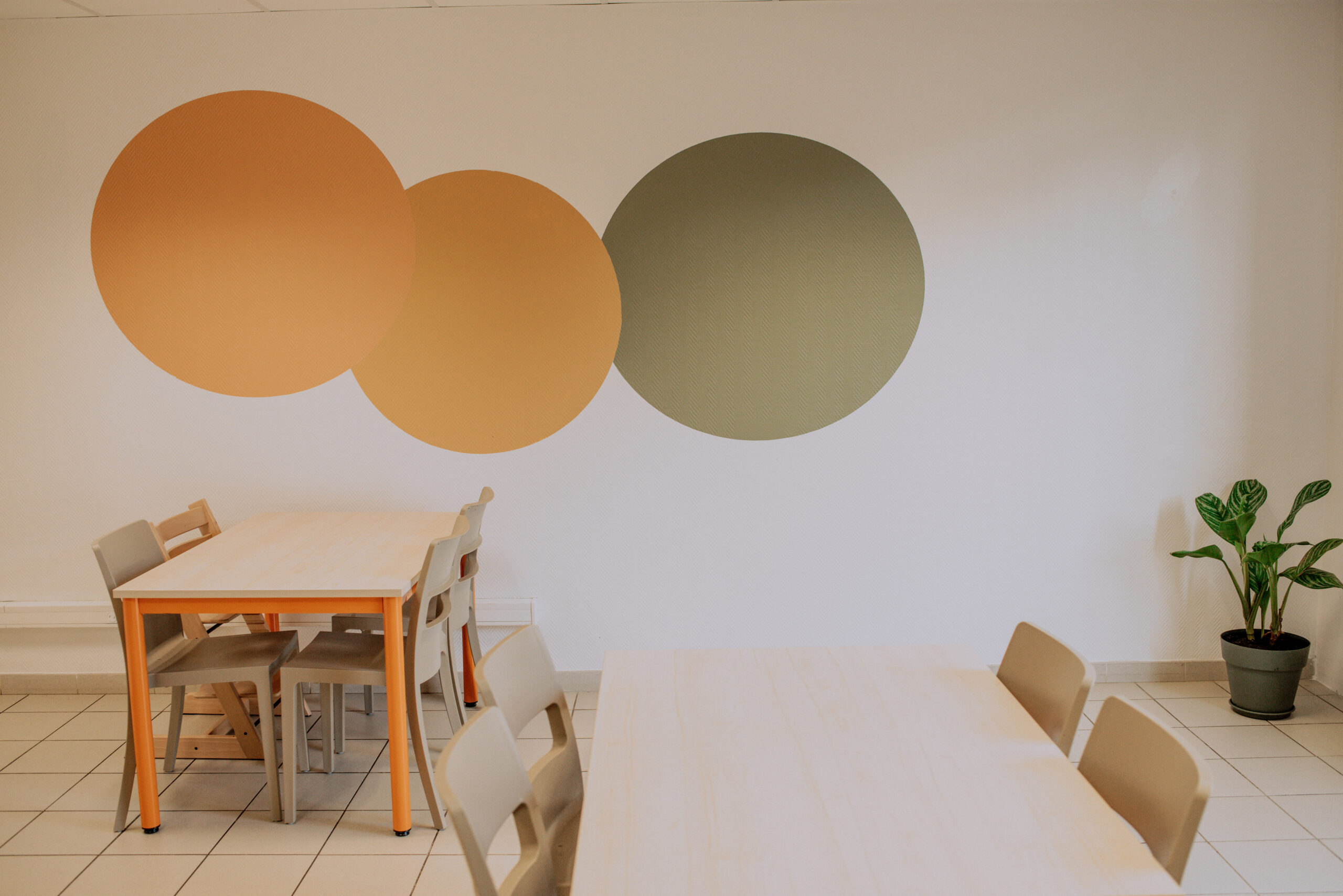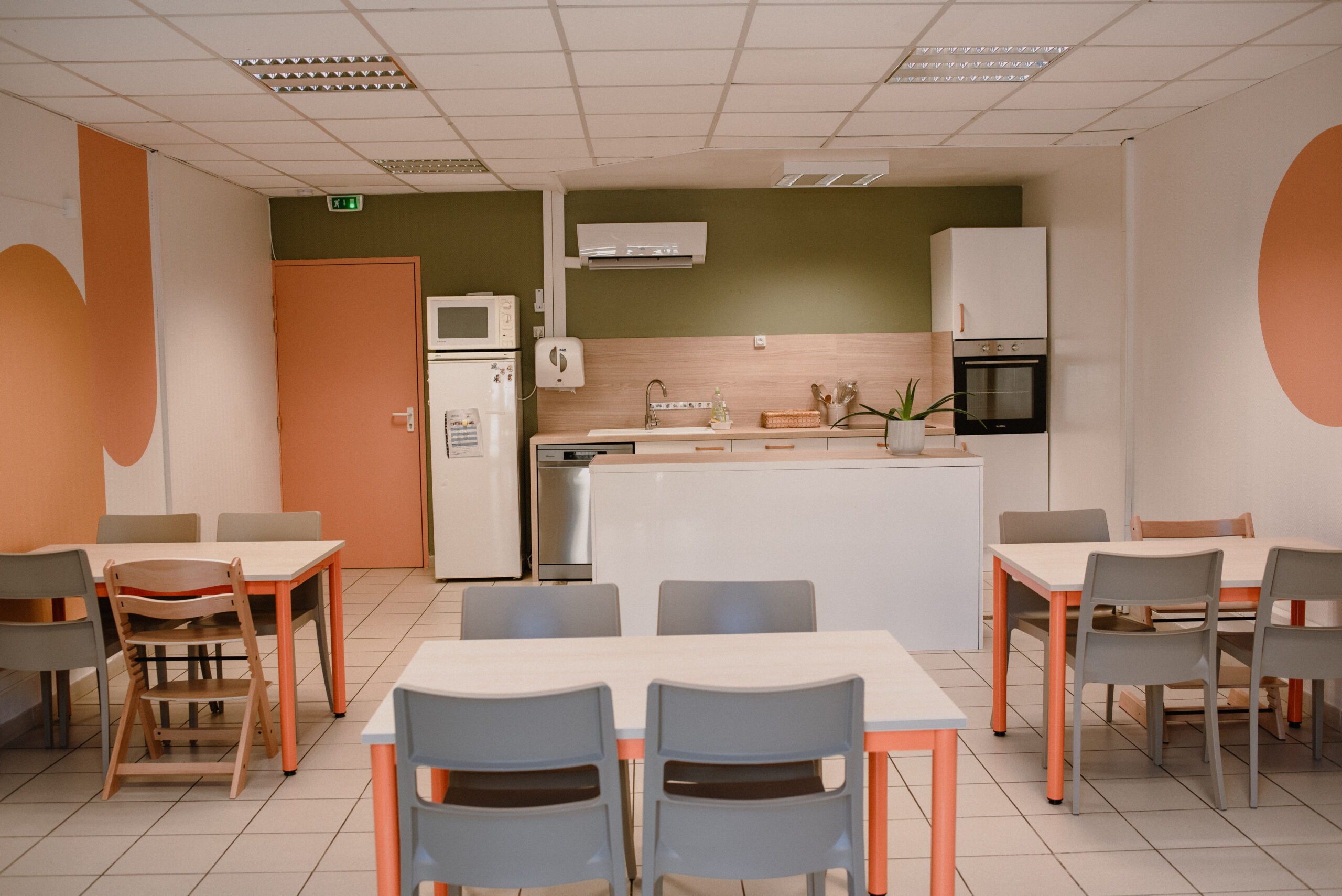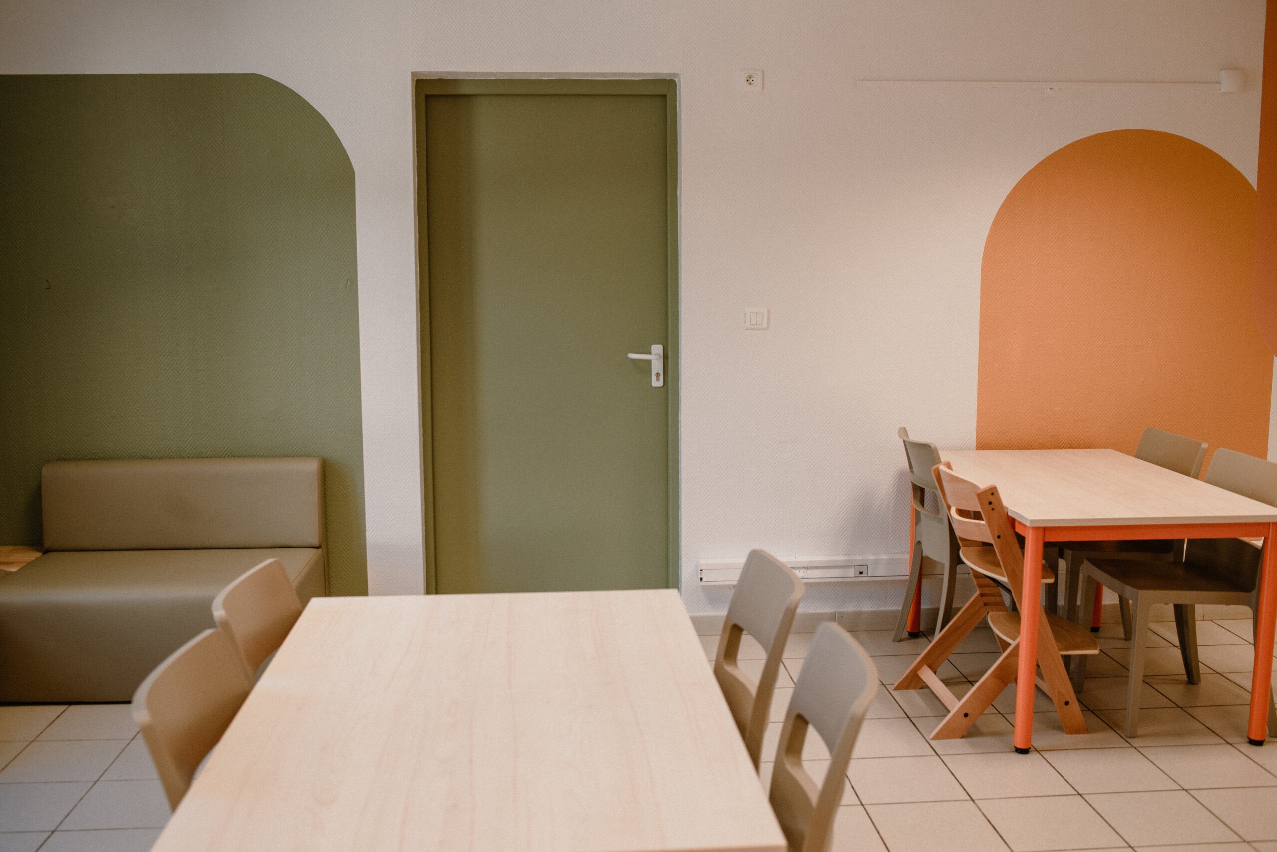 Les couleurs vert, orange et jaune, reprises dans les différents espaces de l’établissement, structurent visuellement la salle et apportent une ambiance plus chaleureuse et dynamique.