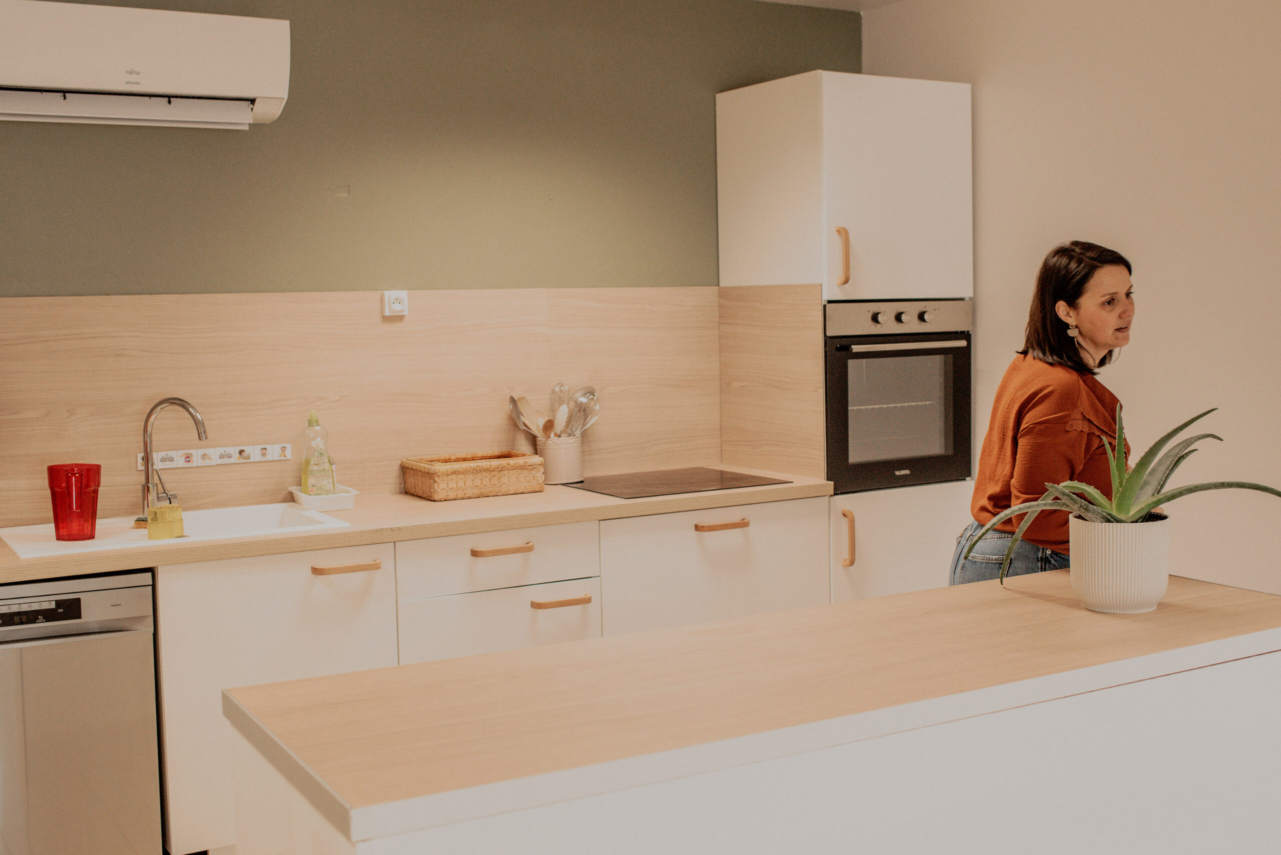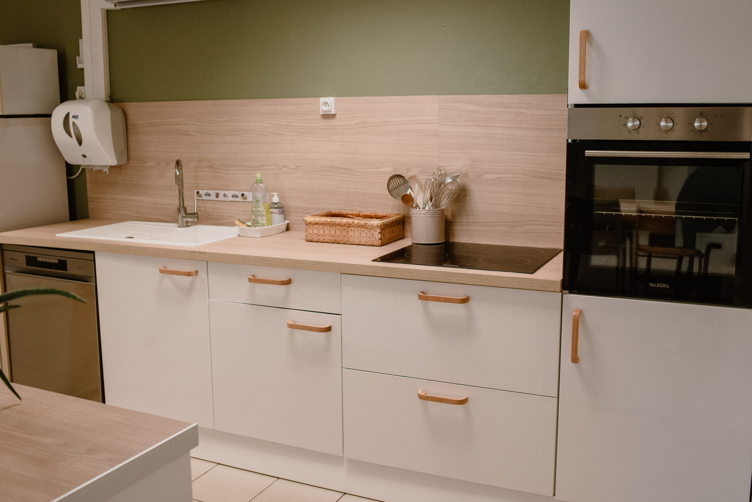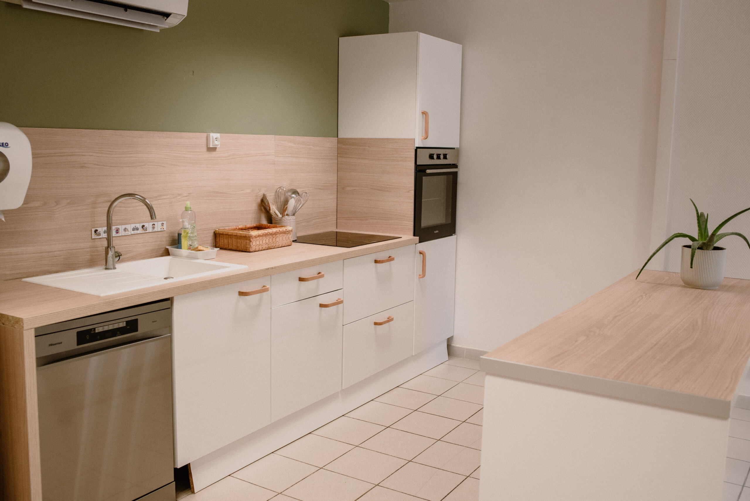 La nouvelle cuisine, plus contemporaine, avec des poignées en bois adaptées aux enfants, favorise leur participation aux gestes du quotidien.